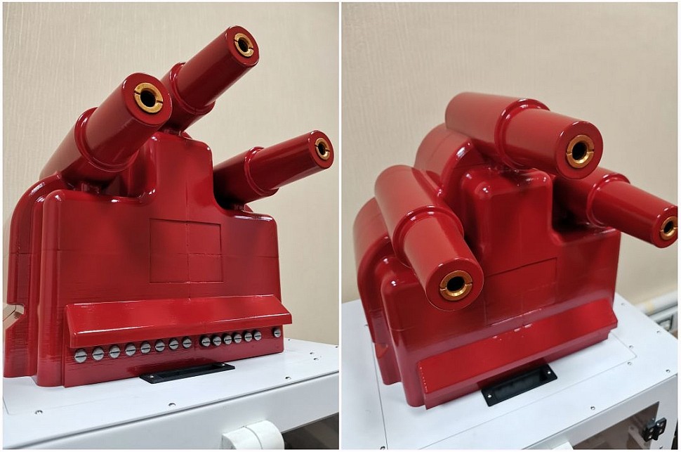 Первый — макет трансформатора размером примерно 50×50 см. Он изготовлен по заказу предприятия, которое производит эти трансформаторы. Оригинальное изделие весит около 70–80 кг, что делает его транспортировку на профильные выставки проблематичной. Напечатанный макет весит около 3 кг — его можно поднять одной рукой, что значительно упрощает логистику и демонстрацию потенциальным клиентам.
