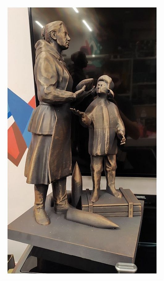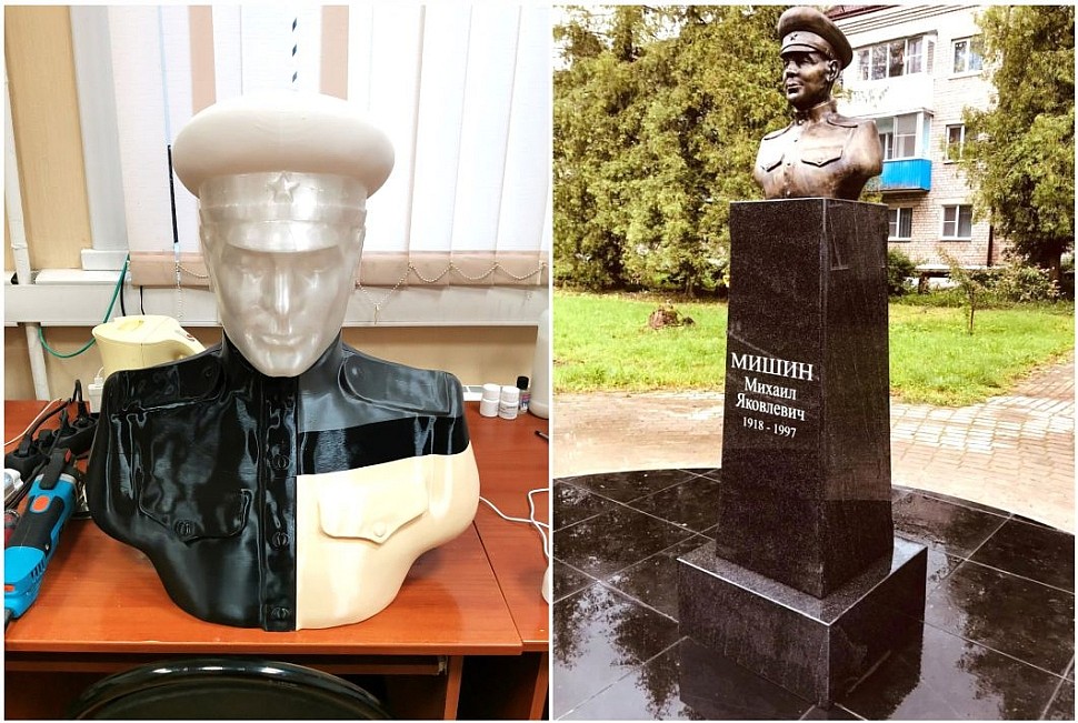 Второй проект — изготовление памятника ветерану Великой Отечественной войны. Студия создала 3D-модель бюста на основе архивных фотографий ветерана и снимков его внука, внешне похожего на деда. Был напечатан пробный миниатюрный вариант на фотополимерном принтере для утверждения. Затем напечатан полноразмерный бюст из PLA-пластика высотой 70 см. После постобработки и снятия силиконовой формы была отлита копия из искусственного камня, которая и была установлена. В планах — отливка бронзовой версии по той же мастер-модели.