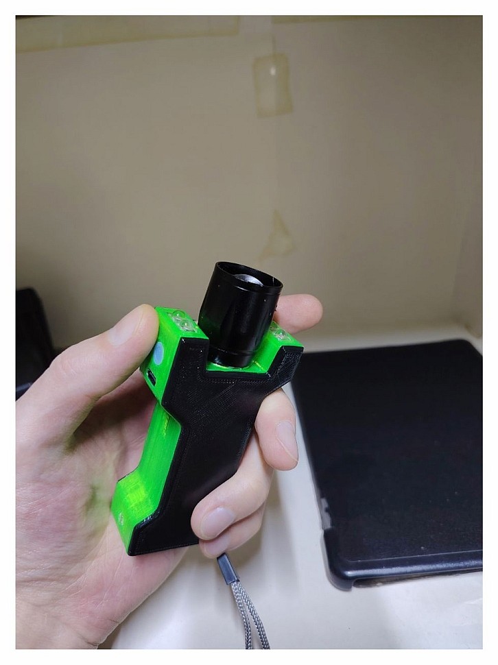 Изначально был куплен фонарик на Ozon, но он оказался со слабым аккумулятором. Тогда владелец решил переделать его под себя: спроектировал и напечатал новый корпус, установил аккумулятор 21700 и перепаял светодиод на более мощный — «лазерный». В итоге получился удобный в эксплуатации инструмент.